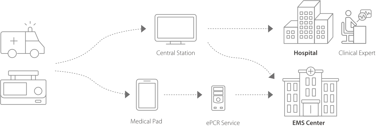 Данные о вентиляции лёгких и мониторинге состояния пациента во время транспортировки могут передаваться в больницу в режиме реального времени. Медицинский персонал может удалённо контролировать вентиляцию лёгких и жизненно важные показатели пациента с помощью CMS (центральной системы мониторинга) больницы или системы ePCR для своевременной разработки плана лечения.