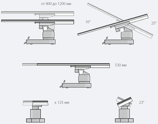 Регулировка высоты, латеральных и продольных наклонов (Тренделенбург/ антиТренделенбург), а также выравнивание ложа в положение «0» выполняется электрогидравлической системой со встроенными аккумуляторами.