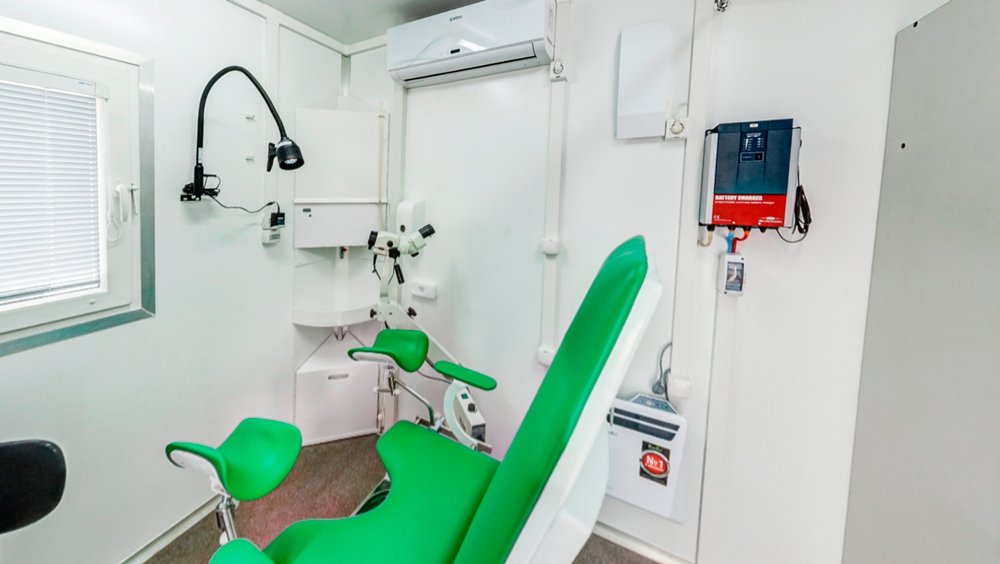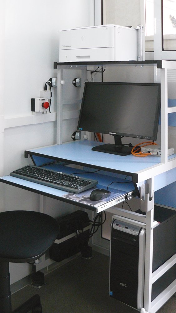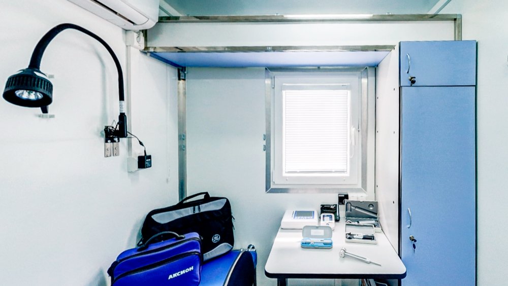 - Лабораторный и диагностический кабинеты оснащены всем необходимым специализированным медицинским оборудованием для профилактических осмотров населения. Для защиты от вибрационных и транспортных нагрузок, вся мебель и медицинское оборудование при перевозке надежно фиксируется.