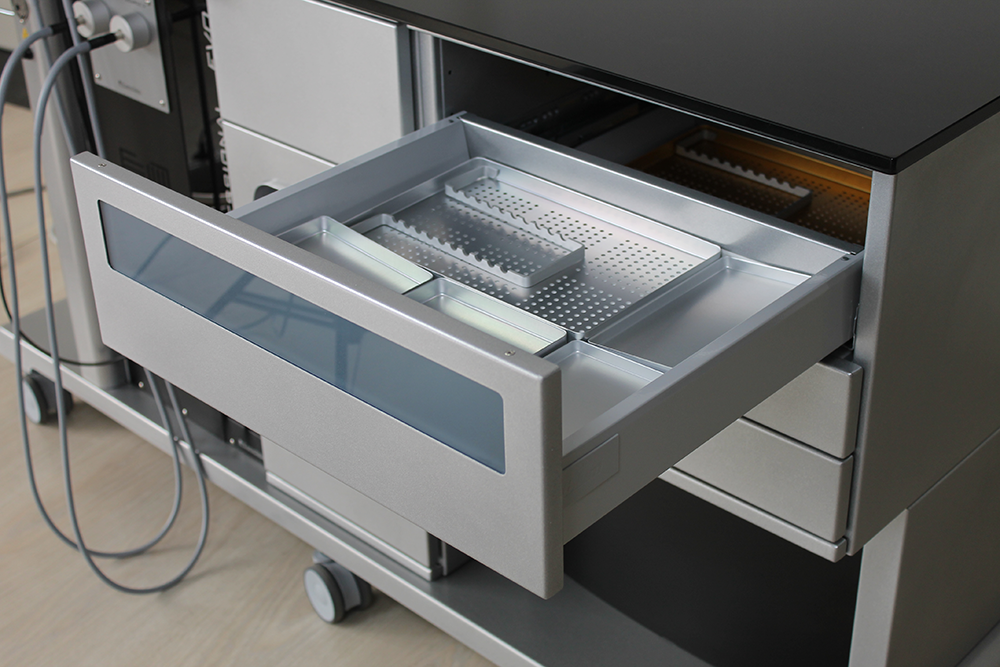 • Удобное хранение инструментария. Комбайн имеет 4 ящика для хранения инструментария, которые выдвигаются автоматически при нажатии, что позволяет врачу открывать ящик, не снимая стерильные перчатки. Все ящики оснащены металлическими лотками (автоклавируемыми) для инструментов. В верхнем ящике для поддержания стерильности инструментария установлена бактерицидная УФ-лампа;