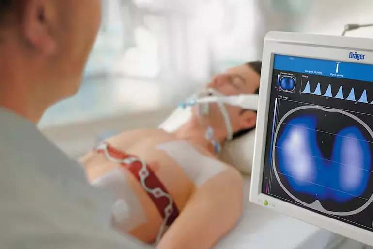 Позволяет оценивать региональное распределение дыхательного объема при искусственной вентиляции легких, а также изменения объема легких в конце выдоха. Вы можете результаты терапевтических процедур и контролировать их в течение всего времени. Благодаря этому аппарат поможет вам поддерживать оптимальное распределение воздуха в легких и проинформирует вас о том, как такие состояния, как ателектаз, чрезмерное раздувание легких, задержка воздуха в легких, плевральный выпот или пневмоторакс могут повлиять на вентиляцию.