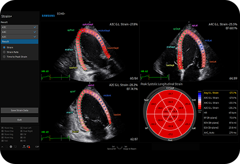 Количественная оценка движения стенки левого желудочка Strain+ представляет собой количественный инструмент для измерения общего и сегментарного движения стенки левого желудочка (ЛЖ). Три стандартных вида левого желудочка и "Яблочко" отображаются на четырехэкранном экране для удобства оценки функции левого желудочка.