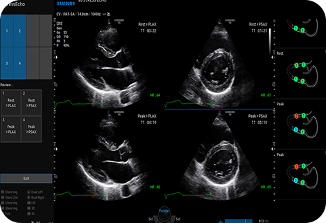 Инструмент автоматической отчетности для диагностики сердца HeartAssistTM, функция, основанная на технологии глубокого обучения, обеспечивает автоматическую классификацию ультразвукового изображения по видам измерений, необходимым для диагностики сердца, и предоставляет результаты измерений.