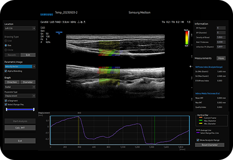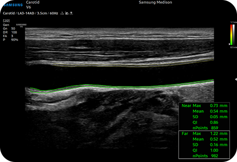 Измерьте IMT одним щелчком мыши AutoIMT+ представляет собой инструмент скрининга для анализа потенциального риска сердечно-сосудистых заболеваний у пациента. Она позволяет легко измерять толщину интимы-медиа как передней, так и задней стенки общей сонной артерии одним нажатием кнопки.