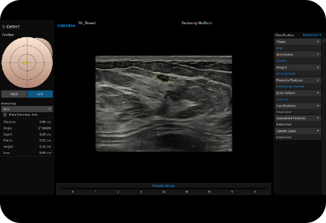 Анализируйте выбранные поражения молочной железы и сообщайте об оценке состояния молочной железы S-DetectTM,³ для молочной железы анализирует выбранные поражения при ультразвуковом исследовании молочной железы и отображает данные анализа, применяет BI-RADS ATLAS * для предоставления стандартизированной отчетности; и помогает в диагностике благодаря упрощенному рабочему процессу.