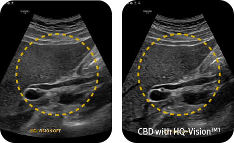 Устранение размытых областей на изображении HQ-VisionTM обеспечивает более четкое изображение за счет смягчения характеристик ультразвуковых изображений, которые немного размыты по сравнению с реальным зрением.