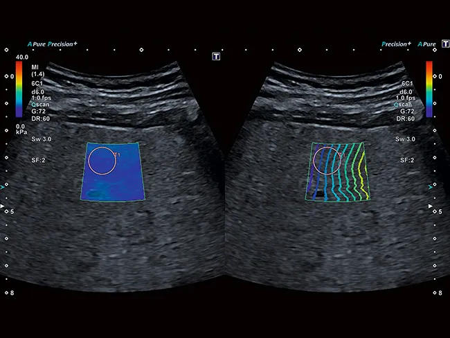 Технология сдвиговых волн Aplio обеспечивает количественное измерение эластичности тканей и отображение ее в режиме реального времени в различных клинических условиях. Интеллектуальные карты помогают визуально оценить распространение и качество эластограммы.