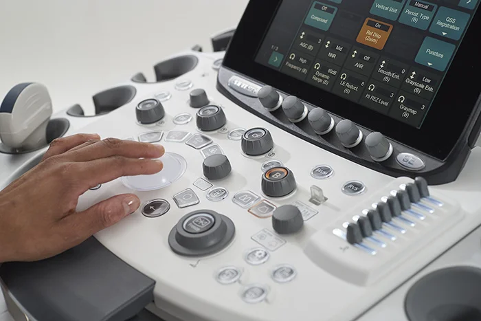 Система оснащена дополнительным цветным сенсорным экраном, на котором отображаются вспомогательные элементы управления, вид и расположение которых зависят от режима работы системы и области исследования.