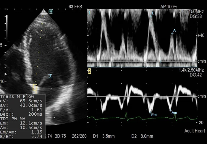 Функция iDGD позволяет получить соотношение E/e` всего за несколько секунд! Возможна автоматическая установка обоих контрольных объёмов для одновременного получения двух спектров за одно сердечное сокращение, а также автоматическое определение пиков сигналов для измерения. Более того, программа может самостоятельно выделить стабильный R-R-интервал по кривой ЭКГ, что чрезвычайно полезно при исследовании пациентов с аритмией.