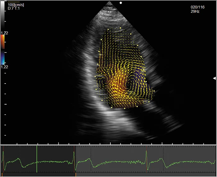 Основной областью применения векторного картирования кровотока являются турбулентные потоки в камерах сердца. Именно такие потоки отвечают за распределение кинетической энергии, необходимой для перенаправления потоков крови и работы клапанов сердца.